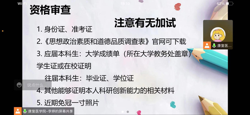 为持续推进我校考研指导工作,做好考研跟踪服务,解决同学们复试阶段的困难与疑惑,从而有准备、有规划的备战,切实提高考生的考研录取率,3月13日,智行书院与康复医学院协同举办了2023届考研复试线上指导交流会。会议由康复医学院李婷老师主持。