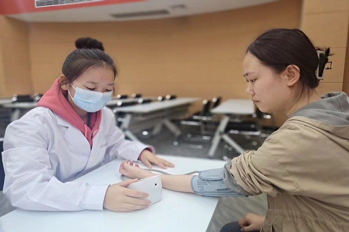书院工会联合学生第九党支部于书院多功能报告厅开展了“健康义诊进书院”活动。义诊过程中,志愿者们向师生提供了量血压、推拿、按摩等医疗健康服务,并向在场大家普及了日常保健常识,帮助大家树立健康生活理念。来自2022级康复治疗学专升本的学生张志宾手上操作娴熟。“老师,您肩颈发紧,平时工作中每超过1小时,应稍休息几分钟,做颈部运动或按摩。”张志宾贴心地向正做颈椎推拿的孙老师说道。志愿者们细心的服务,精湛的医术,给师生们留下深刻印象。