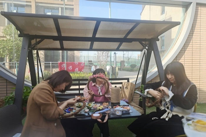 下午茶是能量的加油站,一个美美的下午茶打通了老师们的任督二脉,工作能量瞬间加满!同时为了体现书院对女教师的关爱,书院工会还开展了“向春天说HELLO”花环DIY活动,特邀请了通识教育学院人文素质教育教研室教师王康现场教学花环手工制作技法。活动开始,王康向老师们细致讲解了制作花环的过程与注意事项,并展示了一些优秀作品。随后,老师们充分发挥自己的想象,红色、蓝色、紫色……用各式各样的干花、丝带、麻绳等装饰品装扮丰富花环,展示了良好的手工制作能力。转眼间,一个个洋溢着春日暖阳的美丽花环诞生在老师们手中。大家拿着自己的作品,纷纷拍照留影,活动现场欢声笑语不断。
