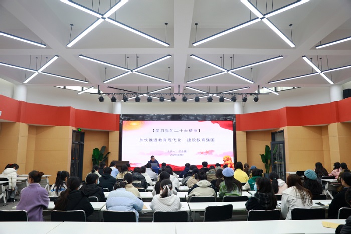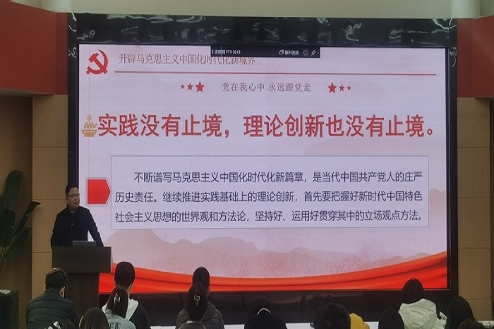 刘凯围绕新时代新征程中国共产党的使命任务、开辟马克思主义中国化时代化新境、实施科教兴国战略,强化现代化建设人才支撑以及推进文化自信自强,铸就社会主义文化四个方面对二十大精神作了全面的解读和深入阐释,并希望学生们立足二十大精神,以更加昂扬的精神状态和务实的工作作风,踔厉奋发、勇毅前行,