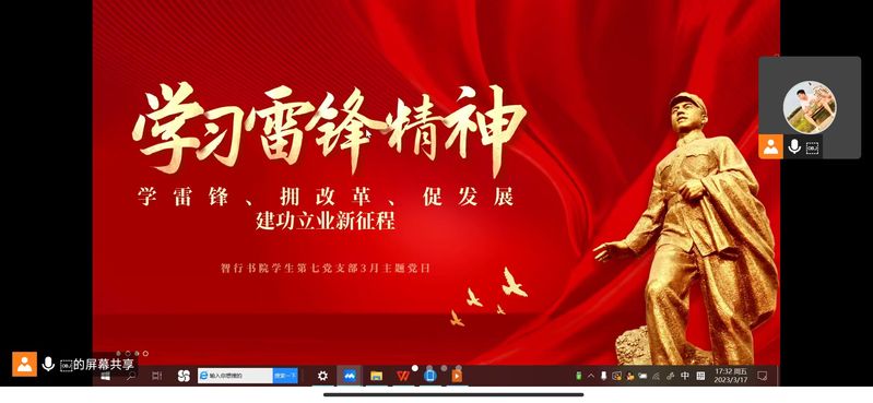 3月17日,智行书院学生第七党支部采用线上+线下的模式,组织开展“学雷锋、拥改革、促发展、建功立业新征程”主题党日活动,活动由支部书记胡海洋主持,支部全体成员参加。