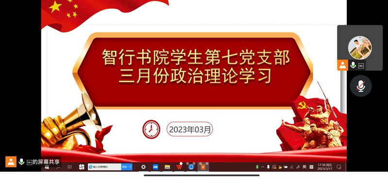 3月17日下午,智行书院学生第七党支部于线上开展三月份政治理论学习。会议由党支部书记胡海洋主持,党支部全体党员参加。