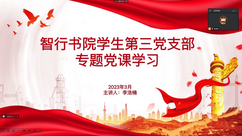 为深入推进党史学习教育走深走实,传承红色基因,坚定理想信念,进一步强化党员思想政治教育,3月22日智行书院学生第三党支部通过腾讯会议开展了“学党史 铭党恩 跟党走”党课学习。此次党课由党支部书记李浩楠主讲,支部全体党员参加。
