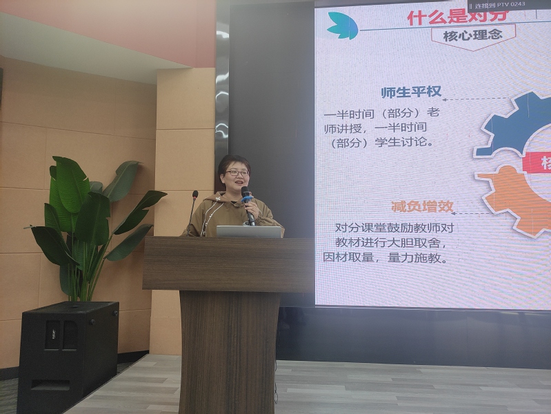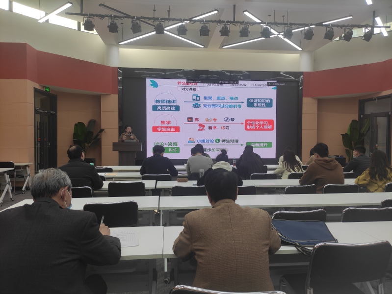 会上,王桂琴回顾了自己五年的对分课堂教学改革历程,从“什么是对分、为什么要用对分、该怎么做、取得的成效”四个维度阐述了对分课堂的创立发展和核心理念,并结合具体课程分享了对分课堂实践经验,使全体参会教师直观理解和感受对分课堂。她指出,对分课堂的核心在于教师讲授后,通过亮考帮让学生去独立学习、内化吸收,随后组织生生、师生研讨进行答疑解惑,从而构造了全新的教学流程,即讲授、独学、讨论、对话,实现从“以教为主”的灌输式学习向“以学为主”的主动式学习转变,让学生获得学习乐趣,提高学习效率,并且减轻了教师的教学负担,为推进课堂教学改革开辟了新的路径。