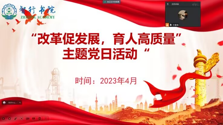 为进一步学习党的二十大精神,扎实推动教育高质量发展。4月17日晚智行书院学生第一党支部于线上开展以“改革促发展,育人高质量”主题党日活动,会议由支部书记李莹莹主持,支部全体党员参加。