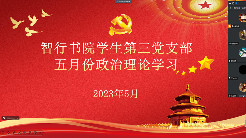 5月22日下午,智行书院学生第三党支部通过腾讯会议开展五月份政治理论学习。会议由党支部书记李浩楠主持,学生第三党支部全体成员参加。