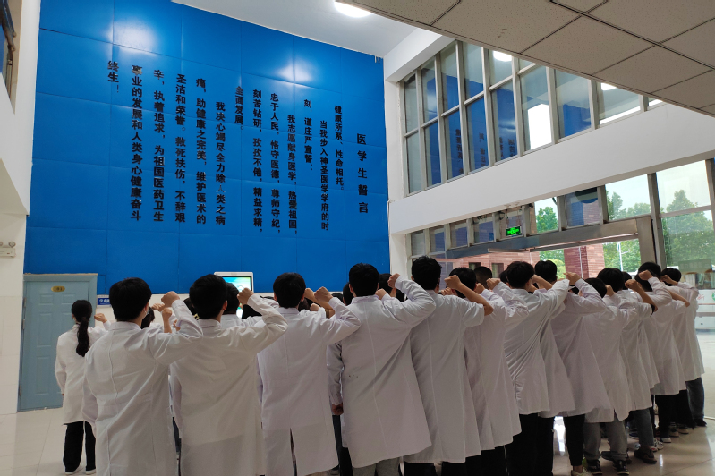 “健康所系,性命相托。当我步入神圣医学学府的时刻,谨庄严宣誓,我志愿献身医学,热爱祖国,忠于人民”震人发聩的铮铮誓言回响在教室各个角落,来自医疗专业的实习生在辅导员的带领下进行庄严的集体宣誓。同学们高举右拳,面带虔诚,认真宣读誓词,激励着大家在接下来的实习和就业中将竭尽所能履行誓言,以昂扬的精神风貌和饱满的工作热情用心服务好每一位病人,成长为优秀的医务工作者!