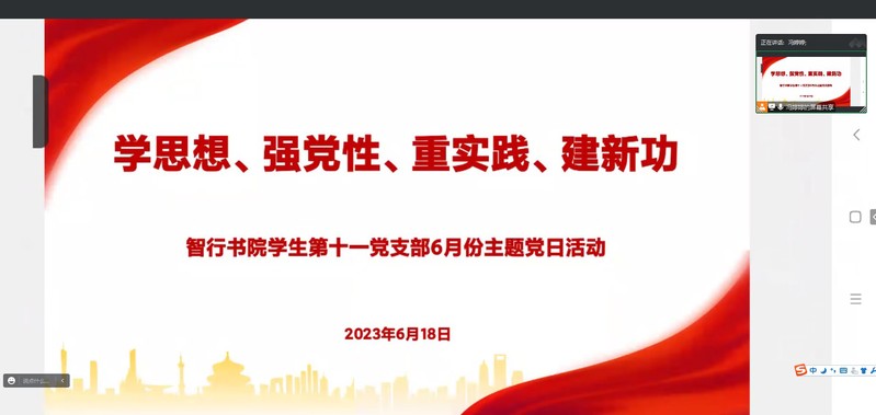 为深入开展学习贯彻习近平新时代中国特色社会主义思想主题教育,有效发挥党员先锋模范作用,6月18日中午,智行书院学生第十一党支部开展了“学思想、强党性、重实践、建新功”主题党日活动,活动由党支部书记冯婷婷主持,支部全体成员参加。