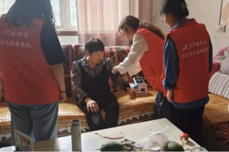 在活动过程中,队员张璐璐、吴玉茹、付敏杰走进村子里的大街小巷,为中老年人测量血压,并给村民们提供安全用药、紧急救助等知识宣讲服务。村民们热情好客,不停地会邀请成员们回家坐会,消消暑气。