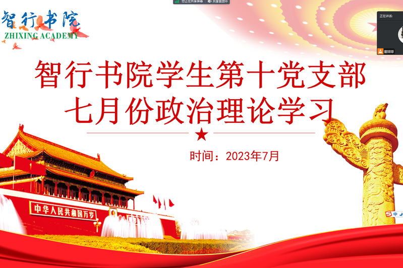 7月11日晚,智行书院学生第十党支部通过腾讯会议开展七月份政治理论学习,本次学习采用“集中学习+研讨”的方式进行。会议由党支部书记董婷婷主持,党支部全体党员参加。
