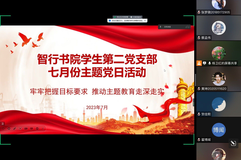 为深入开展学习贯彻习近平新时代中国特色社会主义思想主题教育,7月20日,智行书院学生第二党支部线上开展了“牢牢把握目标要求,推动主题教育走深走实”主题党日活动,活动由党支部书记杨卫红主持,支部全体成员参加。