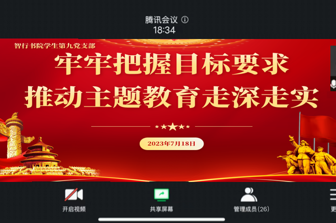 为深入开展学习贯彻习近平新时代中国特色社会主义思想主题教育,7月18日,智行书院学生第九党支部线上线下相结合开展“牢牢把握目标要求 推动主题教育走深走实”主题党日活动,活动由党支部书记高雯雯主持,支部全体成员参加。