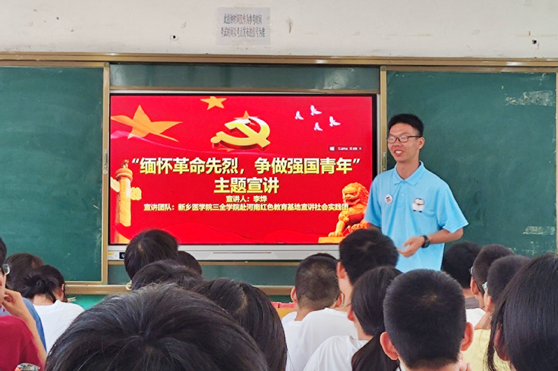 7月20日,宣讲团前往镇平县第一高级中学和新野县蒙学苑教育中心开展党的二十大精神宣讲,激励青少年坚守信仰、砥砺奋进。镇平县第一高级中学学生谭琳浩说:“通过哥哥姐姐们的讲授,让我对学习党的二十大精神的重要性有了更加深刻的认识,我们一定做到听党话、跟党走,在艰苦卓越的奋斗中坚定理想信念,以百折不挠的毅力和勇气去实现我们的人生价值。”