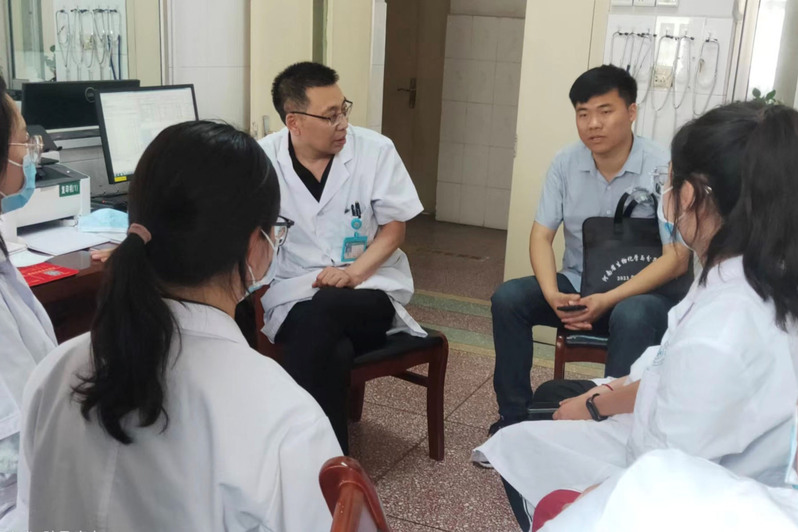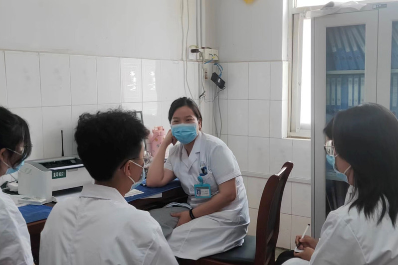7月23日,团队走进医生办公室,与肿瘤科主任医师贾保山和付莹莹医生进行了沟通。贾主任在肿瘤治疗方面有着较深的研究和丰富的治疗经验。他说:“医生需要具备科学研究的思维,因为医生的每一步都与医学基础知识息息相关,基础是大家今后从医之路的基石,所以大家一定要学好专业课,提升综合能力,未来才能观览医学的全貌。”谈到工作经历时,贾主任提到在医院里高压环境压力很大,医生还需要拥有强大的心理素质,但每当治好病人时,所有的不开心都会烟消云散,所有的付出也是值得的。