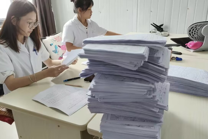 排班老师带领队员们进入医院中开展志愿活动。两位女队员进入医院患者病历档案室,帮助医师记录前来排队就诊的患者咨询的问题,并把问题归纳总结在册子里上交给就诊医师们,为医生节省了诊疗时间。