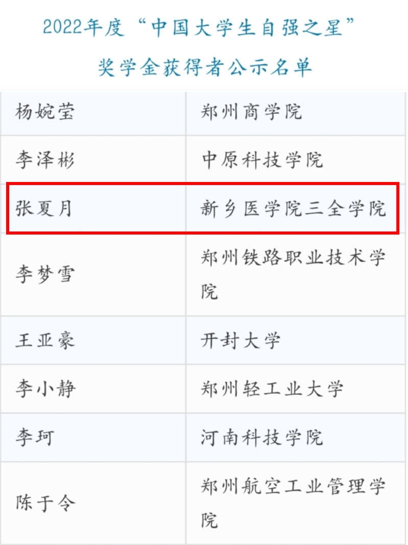 近日,由共青团中央、全国学联指导,中国青年报社、新东方教育科技集团、中国青年创业就业基金会联合举办的“中国大学生自强之星”评选结果揭晓。经学校推荐、省级初评、全国评审等环节,我书院张夏月同学荣获2022年度“中国大学生自强之星”奖学金,这也是我校学子连续两年获得此项荣誉。