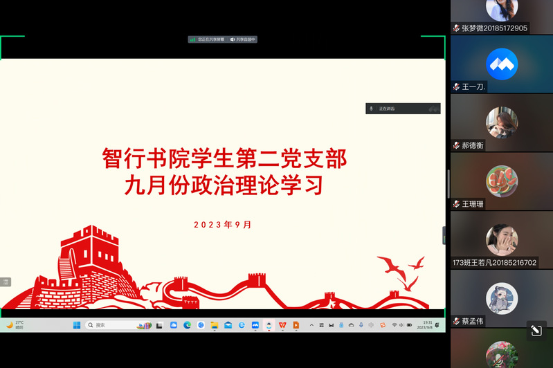 9月8日晚,智行书院学生第二党支部线上开展九月份政治理论学习,会议由党支部书记杨卫红主持,支部全体成员参加。