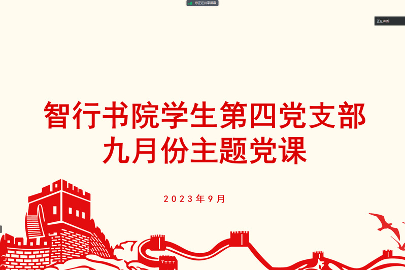 为深入学习宣传贯彻党的二十大精神,引导广大党员坚定理想信念,坚守初心使命,贡献个人力量,9月22日晚,智行书院学生第四党支部线上开展“弘扬建党精神 促科学发展”专题党课。此次党课由党支部书记高渊皓主讲,支部全体党员参加。