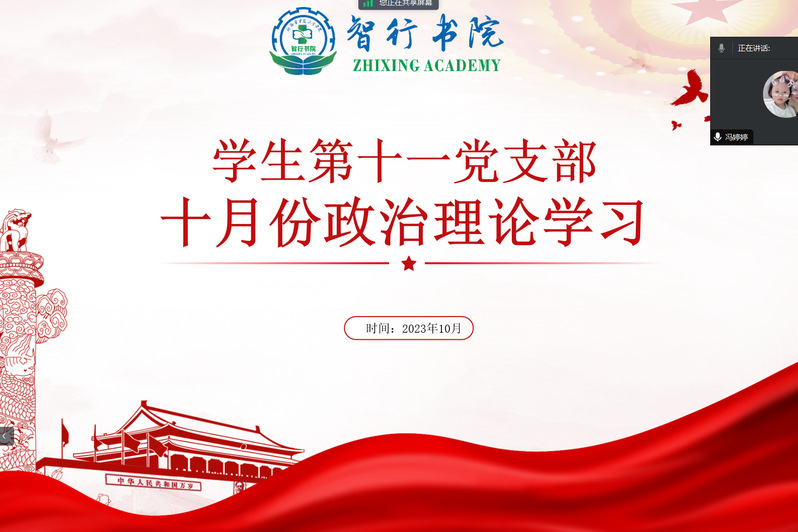 10月22日下午,智行书院学生第十一党支部于线上开展十月份政治理论学习,本次学习采用“集中学习+研讨”的方式进行。会议由党支部书记冯婷婷主持,党支部全体成员参加。
