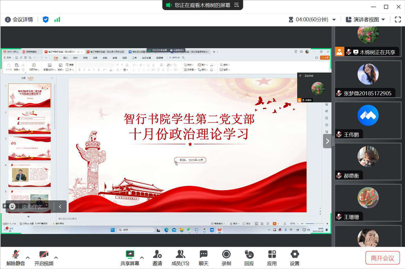 10月19日晚,智行书院学生第二党支部线上开展十月份政治理论学习,会议由党支部书记杨卫红主持,支部全体成员参加。