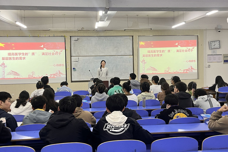 2022级临床医学专业117班谷佳轩同学结合当下社会对基层医生的需求及职业要求分享了自己作为医学生的使命和责任担当。基层医务工作者是居民健康的“守门人”,是与百姓健康密切相关的群体,在工作中,他们没有豪言壮语,只有身体力行,默默奉献,用责任和担当为百姓生命健康构筑起一道道坚实的安全屏障。当下,基层医疗状况不容乐观,他借此机会呼吁广大医学生要迎难而上,以知识铸就梦想,努力提升医学生的“质”,满足未来对基层医生需求的“量”。同学们纷纷表示会不断积累经验,增长才干为基层医疗建设事业贡献自己的微薄力量。