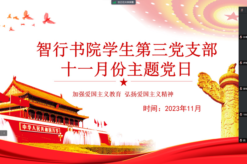为深入学习贯彻习近平新时代中国特色社会主义思想,进一步增强党员爱国意识,激发爱国情怀,11月9日晚,智行书院学生第三党支部通过线上线下相结合的方式开展了“加强爱国主义教育 弘扬爱国主义精神”主题党日活动,此次活动由党支部书记李浩楠主持,支部全体成员参加。
