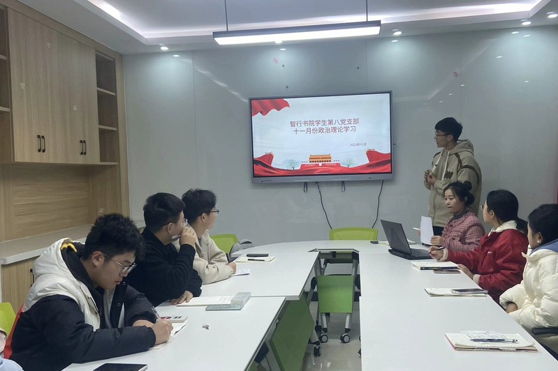 为深入推进学习贯彻习近平新时代中国特色社会主义思想主题教育,加强党员政治理论学习,强化理论武装,11月19日晚,智行书院学生第八党支部于二公寓三楼党支部工作站开展政治理论学习。会议由党支部书记娄冰琼主持,党支部全体成员参加。