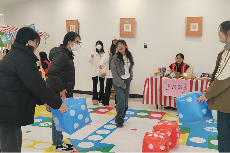 热闹非凡的宿舍文化集市在智行之家内暖意洋洋开启。自制的粘土娃娃、五颜六色的手工艺品、独一无二的文创周边、笑料不断的“飞行棋大战”、精彩连连的互动小游戏,学生们手拿互动卡片,兴奋地在各个摊位前“寻宝”。在各摊位前流传的学生络绎不绝,还有十分热爱手工的智宝连续产出几件作品,创作收获的快乐仍在持续......“这两天正是期中考试的时间,对我来说,参与这些活动不仅能够帮助我释放压力、放松心情,而且有不少纪念品都是咱们书院的‘文创作品’,让我们特别有归属感。”2020级数据科学与大数据技术专业学生孟世博已经和室友集满了积分卡片,正等着兑换精美礼品。