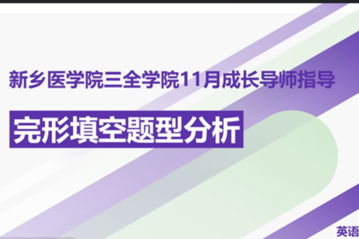 11月17日,外国语学院成长导师朱丹丹于腾讯会议给2020级临床医学专业见习生开展了以“考研英语完形填空题型分析”为主题的指导活动。活动中,朱老师从完形填空的题型分析、复习策略、真题解析三个方面进行了详细讲述。随后,朱老师结合历年真题给同学们分享了做完形填空题的方法和技巧:一是浏览文章,在把握文字脉络之后再逐段阅读做题;二是联系上下文,把选项代入文内,结合语境,进行勘误;三是对照答案,分析错题,总结复盘。最后,朱老师鼓励同学们在备考期间,明确目标和方向,结合自身学习情况制定合理、科学的复习计划,针对性地反复练习、巩固知识,在保持对英语学习的热情的同时,以最佳的学习状态,全力备战,争取在下个月的考试中取得最好的成绩。
