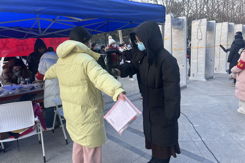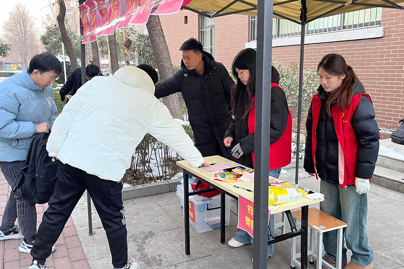 为保障考研学子顺利进入考场,杨蕊老师主动地站出来,带领学生们前往考场,佩戴口罩,手持探测器,一丝不苟地为学生们安检。李浩楠、娄冰琼两位老师则顶着凌晨的月光,为考研学子提供热水、糖果、暖贴、黑色签字笔等物资保障,旨在帮助考研学子充分休息、从容备考。