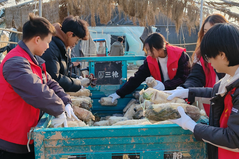 在大棚采摘工作完成之后,志愿者们戴好手套,开启搬运废菌包的工作,对大棚里的废弃木耳菌袋进行清理,将其运送到废菌包处理地。志愿者们分工协作,挨个传递,流水线的工作方式是搬运效率快速高效,各个环节都有条不紊的进行,充分发扬了团队协作精神,虽然天气寒冷,大家却干劲十足。此次志愿活动不仅仅是劳动体验,更是对智行学子们的一次宝贵的教育和锻炼机会。