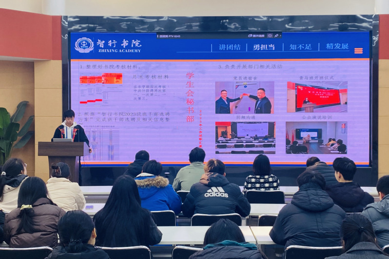 为回顾2023年书院学生组织工作成果,夯实组织力、引领力、服务力和大局贡献度,积极展望下一年度的工作目标和方向,促进各个组织之间的工作交流,1月12日,智行书院团总支在书院多功能报告厅召开2023年度团学组织工作总结暨学生组织2023年工作述职汇报会。