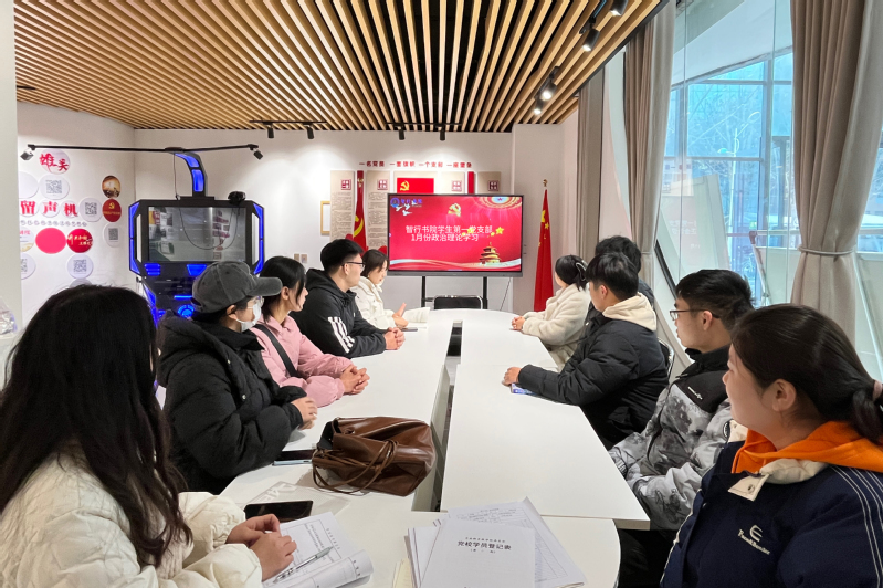 1月18日下午,智行书院学生第一党支部一月份政治理论学习于新时代党员活动室召开,本次学习采用“集中学习+讨论分享”的方式进行,党支部全体成员及入党积极分子参加,党支部书记李莹莹主持会议。