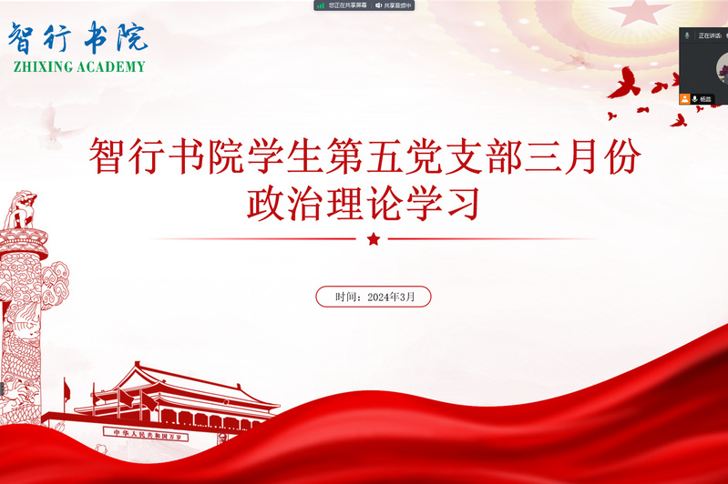 3月21日晚,智行书院学生第五党支部于线上开展三月份政治理论学习,会议由党支部书记杨蕊主持,党支部全体成员参加。