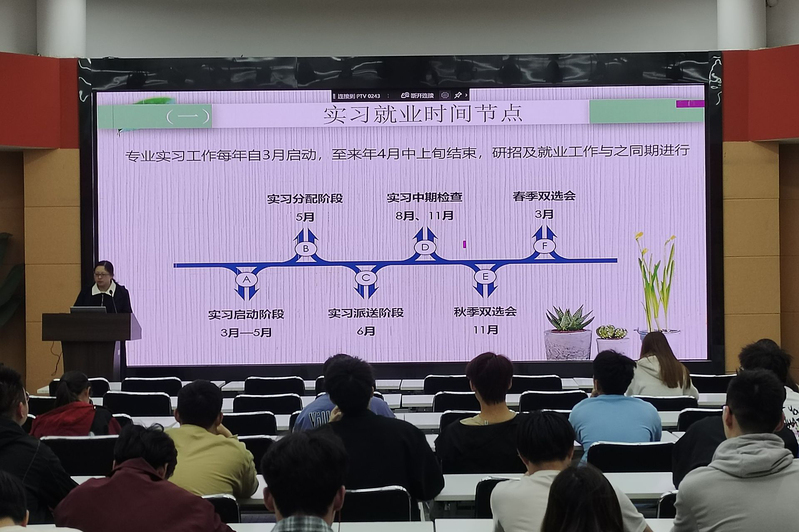 活动中,王老师给同学们详细讲解了不同种类的学科竞赛,包括“挑战杯”“蓝桥杯”“互联网+”等重要竞赛项目,并建议同学们在大学期间要积极参加科研竞赛,从竞赛活动中不断积累实战经验。接着,王老师结合实习时间、实习类型、实习相关要求等内容作了详细讲解,并就实习中可能遇到的问题和挑战给出了合理化建议。针对实习后的就业问题,王老师表示,同学们要在实习期间提前了解相关工作岗位的招聘信息,并制作相应的个人简历,为求职面试做好充足的准备。活动最后,王老师寄语同学们,希望大家在校期间好好学习专业知识,提高职业竞争力,用激情和拼搏追寻自己的理想,开拓一片属于自己的广阔天地。