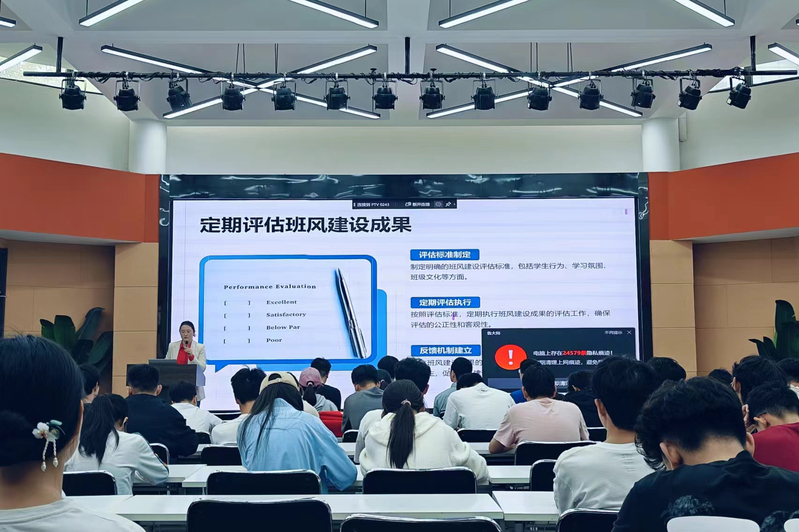 “班风,就是班级的整体风貌、班级的精气神。”朱老师首先给同学们阐明了什么是班风,并对班风的重要性作了详细讲解。她指出,班级是同学们学习成长的主要场所,良好的班风就像一个风向标,能引领大家迈向共同的目标。接着,朱老师以“木桶定律”强调了班级团结的力量,表示要建设优秀班集体,必须采取科学的方法,把“短板”变成“长板”,还要让“长板”不断增长,从而使班级这个“木桶”的“储水量”达到最大值。随后,朱老师从开展活动-增进团结、全员发动-形成共识、加强训练-养成习惯、树立榜样-骨干带头四个方面给同学们介绍了良好班风的养成路径。活动最后,朱老师寄语同学们,希望在大家的共同努力下,不断增进班级凝聚力,营造积极向上的班级文化,创造属于自己独一无二、丰富充实的大学生活。