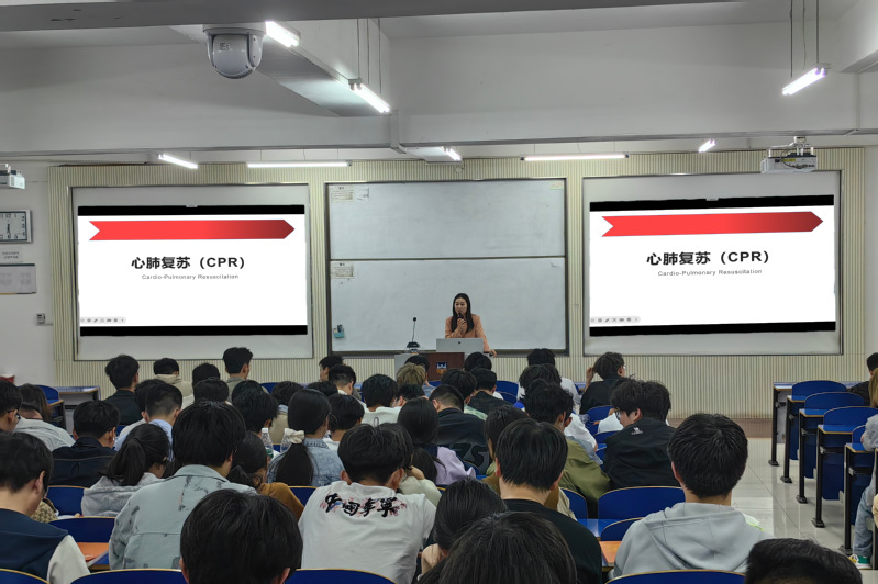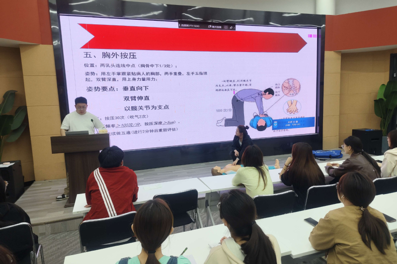 当突发事故和意外事件发生时,及时和正确的应急处置是挽救生命的关键。会上,辅导员首先通过PPT和视频演示等方式介绍了心肺复苏、海姆利克等急救法的操作要点,并重点对急救“黄金4分钟”的重要性以及心肺复苏术的四个步骤:气道开放、人工呼吸、胸外按压和除颤等方面内容进行了详细讲解和现场演示,使同学们更深入更具体地熟悉和掌握操作环节。