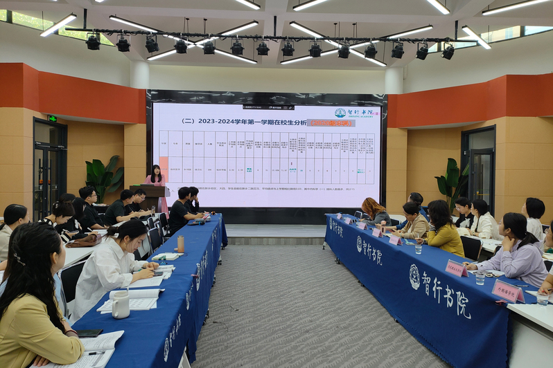 会上,书院通识教研室主任孙峰首先从学生基本情况、整体思想状况、书院学风考风现状及解决措施四个方面向全体教师做了详实汇报。着重就2023-2024学年第一学期在校生同年级、同院系考试情况,同专业同学期挂科情况,实习生就业升学状况等方面结合可视化图表进行对比分析。数据表明,个别班级相较于上学期成绩进步或退步较为明显;同年级班级间正在拉开差距;大一学生仍处于学习的适应期,无法有效利用碎片化时间,书院将从加强日常学风督查、常态化开展“学在智行·博学笃行”学风建设系列活动、加强双院协同育人、开展院系开放日等多项举措进行有针对性的学业帮扶和持续关注,促进学生学业的进步和全面发展,助推书院优良学风的形成。
