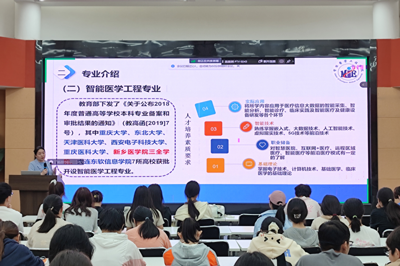 为帮助学生了解专业现状和就业前景,培养学生专业认同感,引导学生明确未来职业发展方向,增强对专业学习的热情和自信心,4月24日,智行书院特邀智能医学工程学院副院长靳瑞霞做客“大咖导师说”,开展了以“专业认同”为主题的知识讲座,2023级生物医学工程、智能医学工程和数据科学与大数据技术专业全体学生线上、线下同步参加。