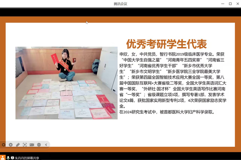 4月24日,外国语学院成长导师朱丹丹于腾讯会议开展了以“考研情况分享”为主题的指导活动。会上,朱老师首先结合2019级临床考研学生的具体情况,从考研人数、院校选择以及考研分数等方面,给同学们深入分析了当前考研形势,并就公共课和专业课的重要性作了阐述,建议大家牢固专业、补齐短板,做到公共课与专业课齐头并进。接着,朱老师以优秀考研学生代表申欣为例,给同学们分享了英语学习的经验和心得,希望大家结合自身情况制定科学合理的复习计划,掌握有效的学习方法和应试技巧,坚定信念,积极应对挑战。最后,朱老师寄语同学们,“长空万里砺鹏志,瀚海千帆竞远舟。”希望大家树立考研信心,尽早开始制定学习规划,从而最终实现求学目标,“一战成硕”。