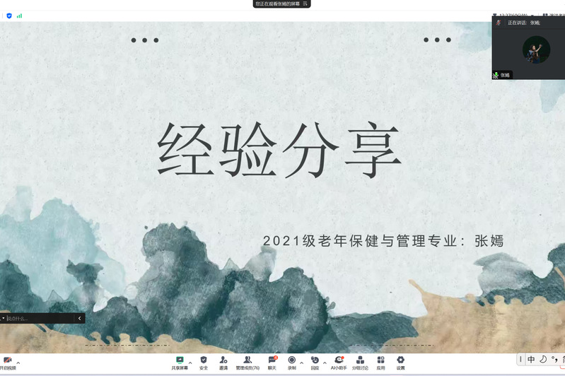 5月18日,2021级优秀实习生代表张鄢为2022级老年保健与管理专业学生开展实习经验分享会。