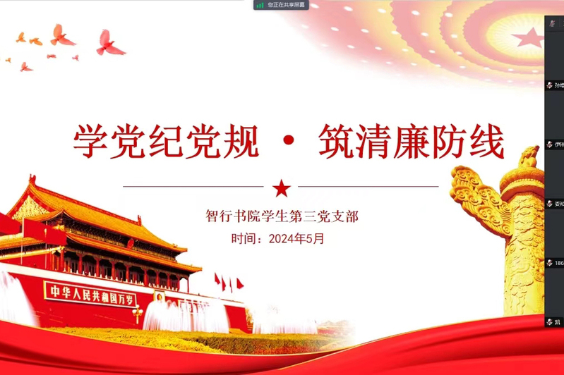 为深入贯彻落实全面从严治党要求,进一步增强全体党员党性观念,强化党员干部纪律规矩意识,筑牢思想道德防线,扎实推进党纪学习教育,5月16日晚,智行书院学生第三党支部通过线上线下结合的方式开展了“学党纪党规 • 筑清廉防线”主题党日活动。