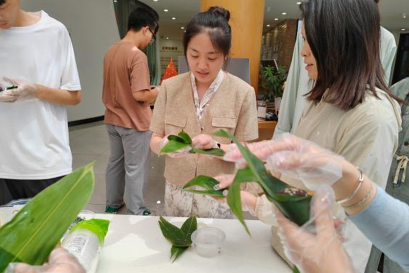 会后,马院学业导师代表张聪卿、李璐璐、韦诗川、赵梦瑶参与了书院端午师生同包粽子活动,大家纷纷拿出看家本领,一同捋粽叶、填糯米、放蜜枣、裹粽叶、扎线绳,师生间彼此交流包粽子的手法和技巧,一派欢声笑语,洋溢着迎接端午佳节的浓厚氛围。