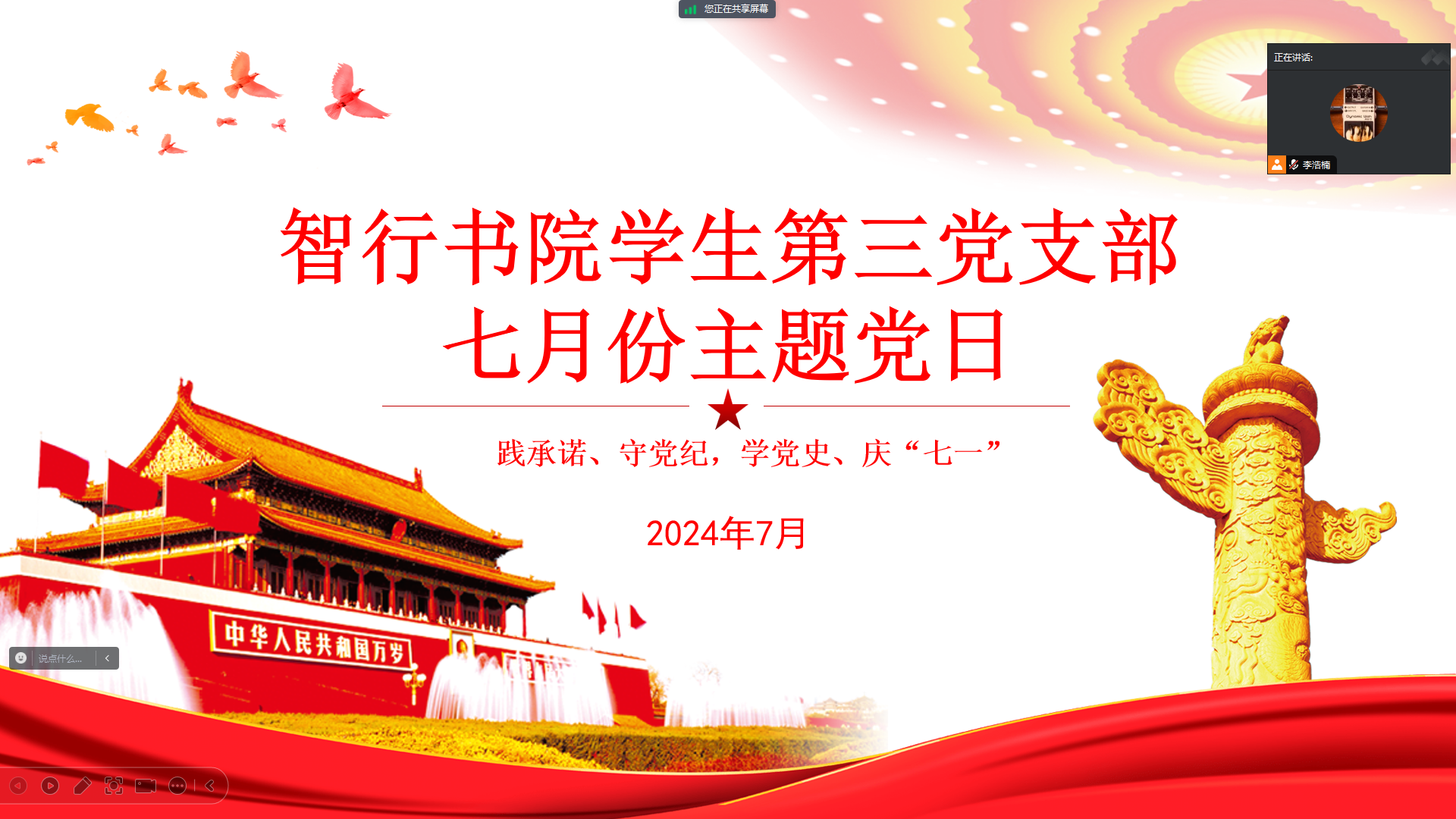 为庆祝中国共产党成立103周年、铭记党的光辉历程,扎实有效开展党纪学习教育,强化党支部成员遵章守纪的自觉性,7月16日晚,智行书院学生第三党支部通过线上的方式开展了“践承诺 守党纪,学党史 庆‘七一’”主题党日活动,本次活动由党支部书记李浩楠主持,党支部全体成员参加。