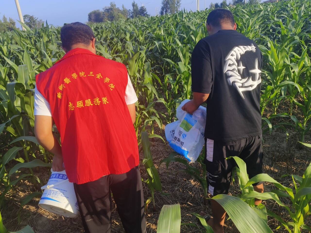 结束参观后,团队成员来到了南阳镇平县张林村迅速投身实践将学习到的红色精神落实到实际行动当中。实践团在烈日下帮助村民干农活。在烈日下,团队成员们不怕苦、不怕累,帮着村民拌农药、打农药,认真完成了每一道工序。团队成员夏乐平颇有感触地说:“亲身参与农业劳动,让我更加珍惜现在的生活,也让我懂得了艰苦奋斗的意义。”