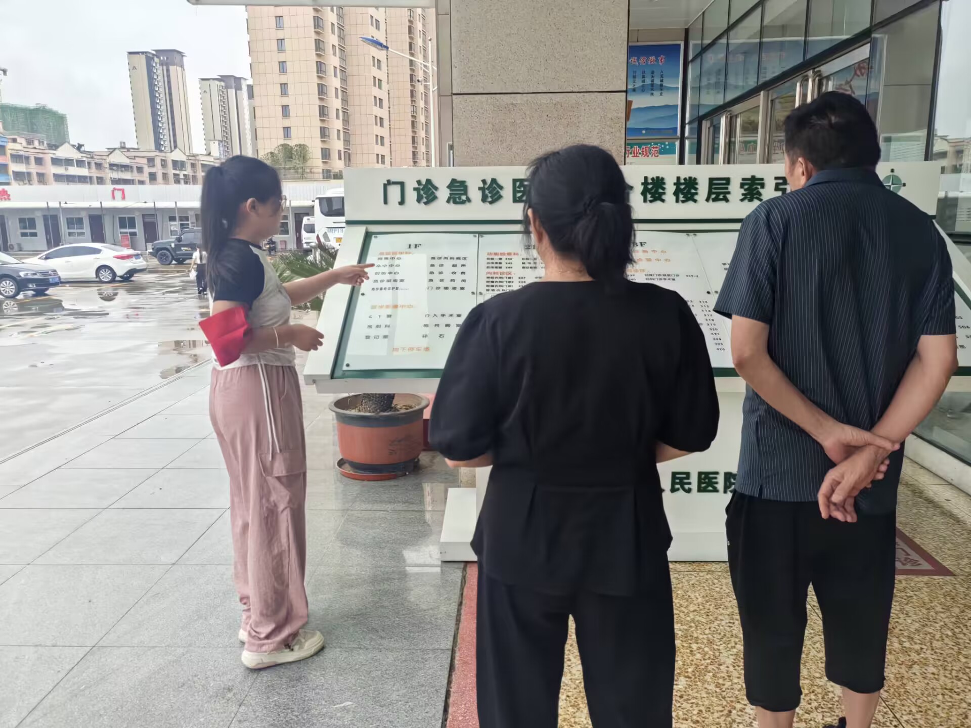 在调查工作完成后,团队成员前往了当地的人民医院。在抵达医院后,团队成员分成两组,第一组负责与医院相关负责人对接,明确服务任务;第二组负责在医院导诊台进行志愿服务,帮助前来就诊的患者指导挂号、指引等工作,减少医院工作人员的负担。两个小组工作安排合理有序,使实践活动顺利进行。接着,团队成员在志愿服务过程中通过具体事例和数据对前来看病的病患和家属进行科普。参与活动的群众表示,医学生通过一些很通俗的语言让我们了解了传染病防治知识,提升了大家健康生活意识。