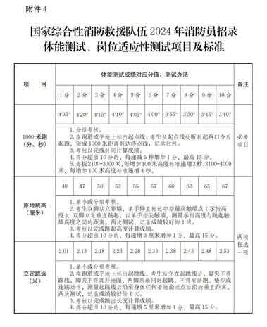 附件4:国家综合性消防救援队伍2024年消防员招录体能测试、岗位适应性测试项目及标准