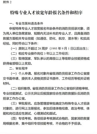 申请特殊专业人才放宽年龄报名的,由本人于7月12日前向省级消防员招录工作办公室提交书面申请和相关证件证书复印件,经省级消防员招录工作办公室组织审核、公示并报应急管理部审批同意后,办理网上注册报名。标准条件和办理程序见附件2。