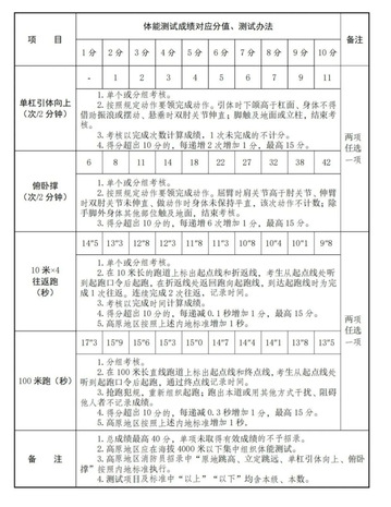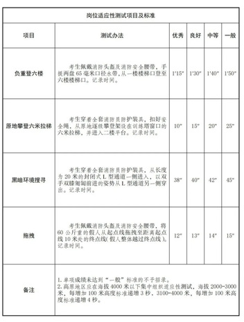 (三)体能测试和岗位适应性测试。《国家综合性消防救援队伍2023年消防员招录体能测试、岗位适应性测试项目及标准》(附件4)执行。体能测试实行量化评分,单项有效成绩为1分~15分(未取得有效成绩的不予招录),总成绩最高40分。岗位适应性测试单项成绩未达到“一般”标准的,不予招录。