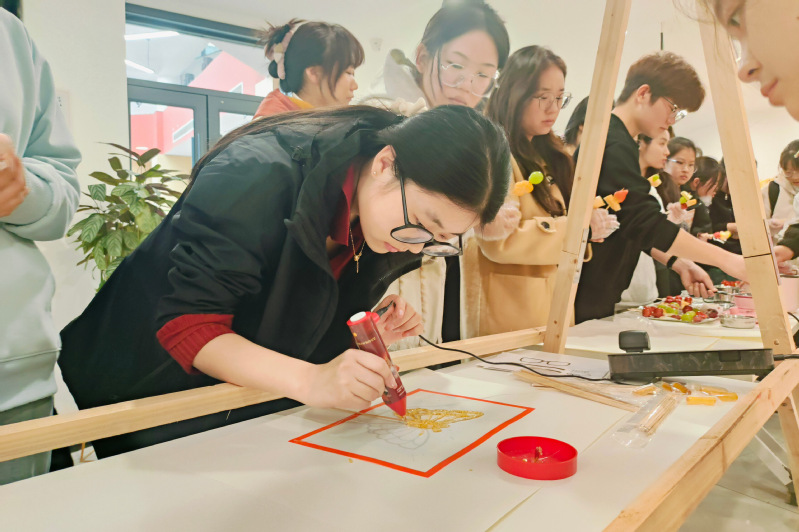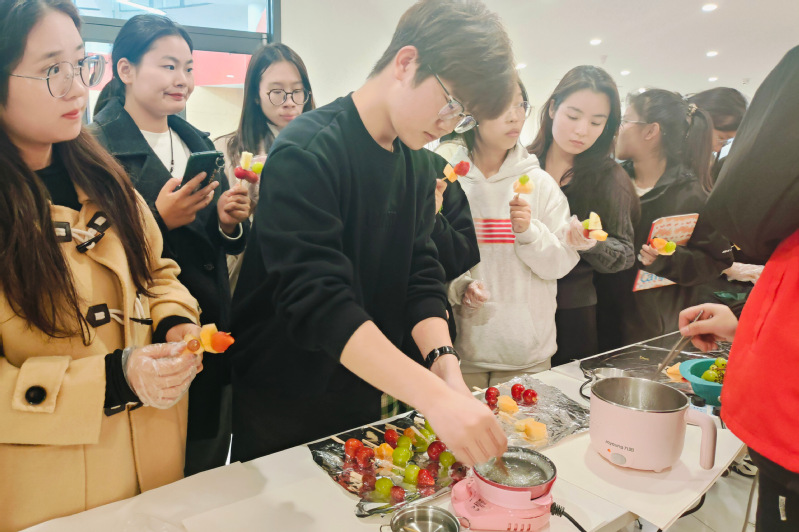 将白糖和水倒入锅中,小火慢熬,糖液在锅中逐渐变得浓稠如蜜,色泽也由浅黄转为金黄,散发出诱人的香甜味道。学生们纷纷排队体验亲手制作糖葫芦和糖画的乐趣,看着糖液变成美食,领悟到最美丽的风景就藏在动手之间。那令人垂涎欲滴的糖葫芦和栩栩如生的糖画,宛如一件件珍贵的艺术品,让学生在享受甜蜜的同时,体会到了劳动的快乐和成就感。甜蜜的时光,甜美的笑容,大家欢聚一“糖”,连空气都带着甜甜的气息。随着最后一道糖汁的流淌,一只栩栩如生的蝴蝶在金黄色的麦芽糖中绽放光芒,这场别开生面的心理教育活动落下帷幕,学生们意犹未尽。2023级生物技术专业贾潆楠表示:“通过这次活动,我感受到了烹饪劳动的乐趣,特别是糖画的魅力,让我了解和喜爱上了这一传统艺术形式。”参与者们纷纷拿起自己的作品合影留念,他们的笑容灿烂而温暖,仿佛是对这次活动最美好的诠释。